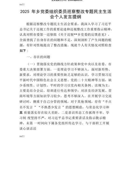 【七哥公文】2025年:【七哥公文】2025年乡X委组织委员巡察整改专题民主生活会个人发言提纲+更多免费公文+VX:QiGeGongWen2024+更多免费公文+VX:QiGeGongWen2024