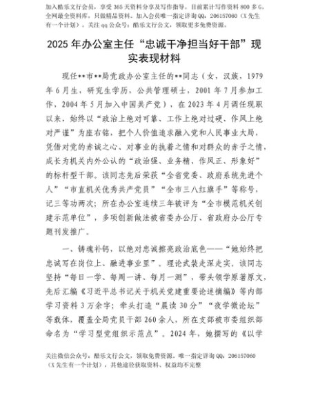 【七哥公文】2025年:【七哥公文】2025年办公室主任“忠诚干净担当好干部”现实表现材料+更多免费公文+VX:QiGeGongWen2024+更多免费公文+VX:QiGeGongWen2024