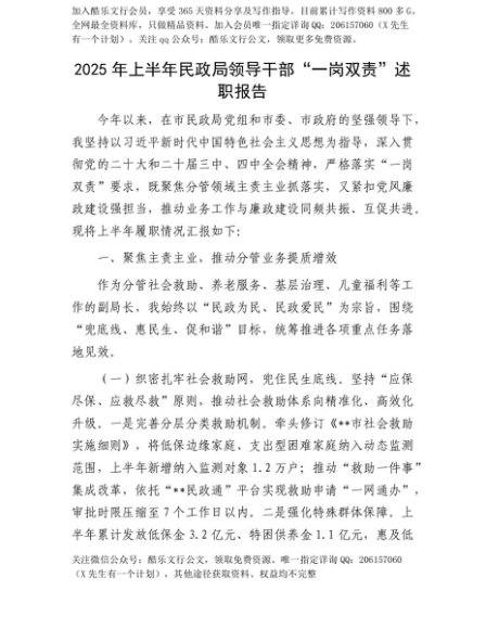 【七哥公文】2025年:【七哥公文】2025年上半年民政局领导干部“一岗双责”述职报告+更多免费公文+VX:QiGeGongWen2024+更多免费公文+VX:QiGeGongWen2024