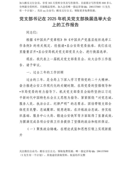 【七哥公文】2025年:【七哥公文】X支部书记在2025年机关X支部换届选举大会上的工作报告+更多免费公文+VX:QiGeGongWen2024+更多免费公文+VX:QiGeGongWen2024
