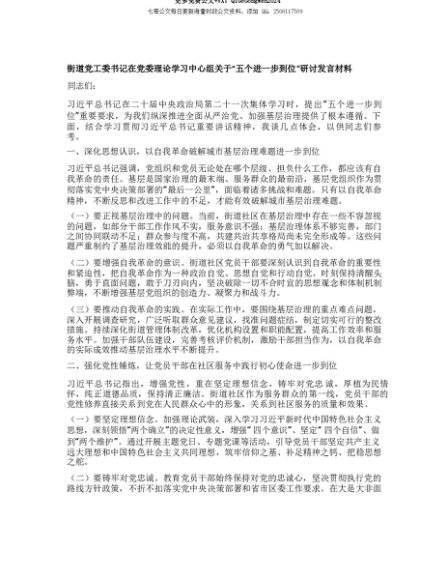 【七哥公文】2025年:【七哥公文】街道X工委书记在X委理论学习中心组关于“五个进一步到位”研讨发言材料+更多免费公文+VX:QiGeGongWen2024+更多免费公文+VX:QiGeGongWen2024