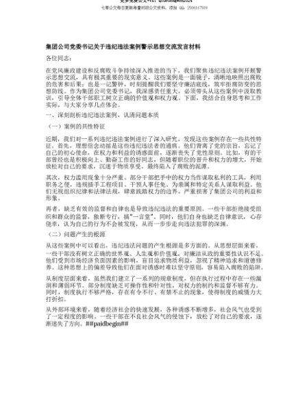 【七哥公文】2025年:【七哥公文】集团公司X委书记关于违纪违法案例警示思想交流发言材料+更多免费公文+VX:QiGeGongWen2024+更多免费公文+VX:QiGeGongWen2024