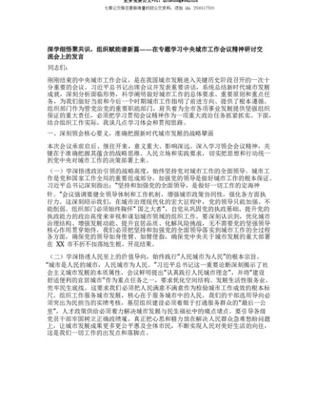 【七哥公文】2025年:【七哥公文】深学细悟聚共识,组织赋能谱新篇——在专题学习中央城市工作会议精神研讨交流会上的发言+更多免费公文+VX:QiGeGongWen2024+更多免费公文+VX:QiGeGongWen2024