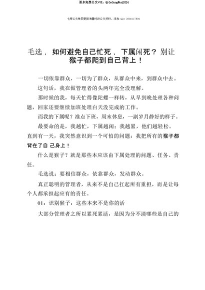 【七哥公文】2025年:【七哥公文】毛选,如何避免自己忙死,下属闲死?别让猴子都爬到自己背上+更多免费公文+VX:QiGeGongWen2024+更多免费公文+VX:QiGeGongWen2024