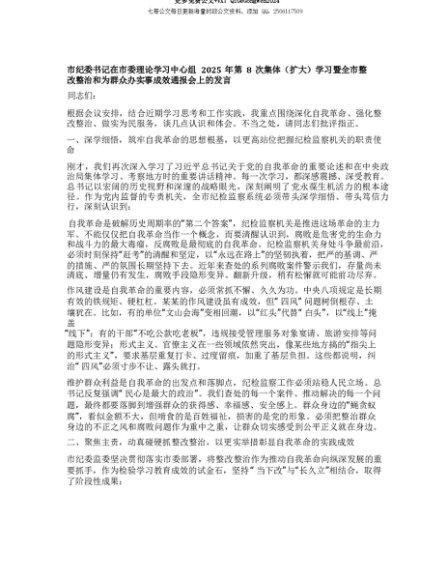 【七哥公文】2025年:【七哥公文】市纪委书记在市委理论学习中心组2025年第8次集体(扩大)学习暨全市整改整治和为群众办实事成效通报会上的发言+更多免费公文+VX:QiGeGongWen2024+更多免费公文+VX:QiGeGongWen2024