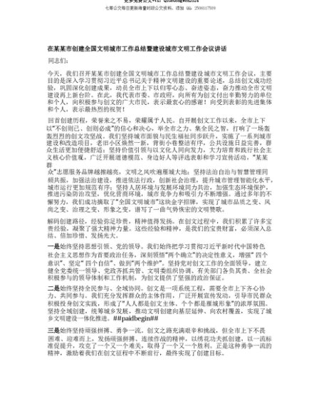 【七哥公文】2025年:【七哥公文】在某某市创建全国文明城市工作总结暨建设城市文明工作会议讲话+更多免费公文+VX:QiGeGongWen2024+更多免费公文+VX:QiGeGongWen2024