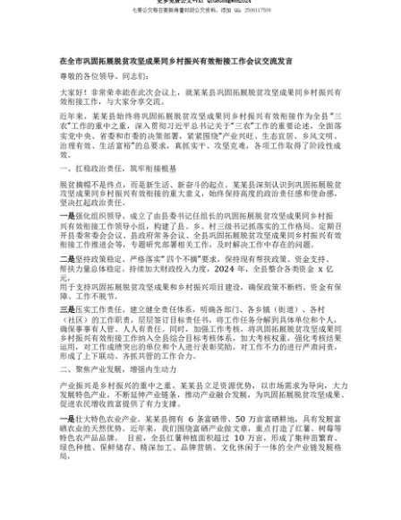 【七哥公文】2025年:【七哥公文】在全市巩固拓展脱贫攻坚成果同乡村振兴有效衔接工作会议交流发言+更多免费公文+VX:QiGeGongWen2024+更多免费公文+VX:QiGeGongWen2024