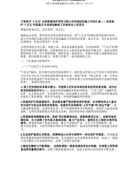 【七哥公文】2025年:【七哥公文】于某某市“十五五”自然资源保护利用与国土空间规划实施工作的汇报 ——在某某市“十五五”市级重点专项规划编制工作座谈会上的发言+更多免费公文+VX:QiGeGongWen2024+更多免费公文+VX:QiGeGongWen2024