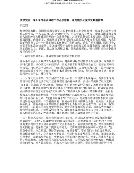 【七哥公文】2025年:【七哥公文】交流发言:深入学习中央城市工作会议精神,谱写现代化城市发展新篇章+更多免费公文+VX:QiGeGongWen2024+更多免费公文+VX:QiGeGongWen2024
