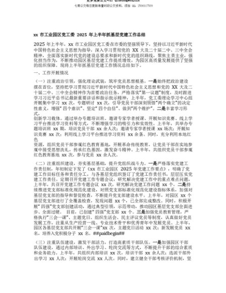 【七哥公文】2025年:【七哥公文】xx市工业园区X工委2025年上半年抓基层X建工作总结+更多免费公文+VX:QiGeGongWen2024+更多免费公文+VX:QiGeGongWen2024