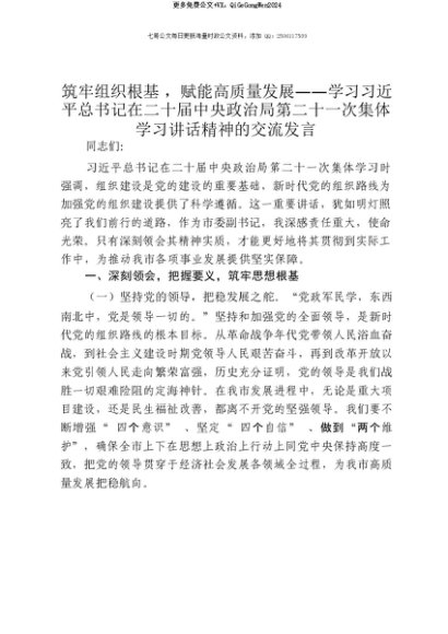 【七哥公文】2025年:【七哥公文】筑牢组织根基,赋能高质量发展——学习习近平总书记在二十届中央政治局第二十一次集体学习讲话精神的交流发言+更多免费公文+VX:QiGeGongWen2024+更多免费公文+VX:QiGeGongWen2024