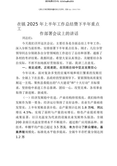 【七哥公文】2025年:【七哥公文】在镇2025年上半年工作总结暨下半年重点工作部署会议上的讲话+更多免费公文+VX:QiGeGongWen2024+更多免费公文+VX:QiGeGongWen2024