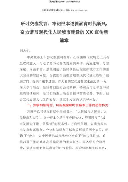 【七哥公文】2025年:【七哥公文】研讨交流发言:牢记根本遵循涵育时代新风,奋力谱写现代化人民城市建设的XX宣传新篇章+更多免费公文+VX:QiGeGongWen2024+更多免费公文+VX:QiGeGongWen2024