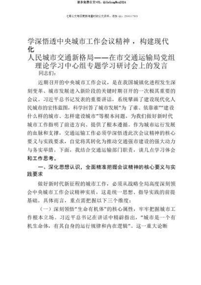 【七哥公文】2025年:【七哥公文】学深悟透中央城市工作会议精神,构建现代化人民城市交通新格局——在市交通运输局党组理论学习中心组专题学习研讨会上的发言+更多免费公文+VX:QiGeGongWen2024+更多免费公文+VX:QiGeGongWen2024