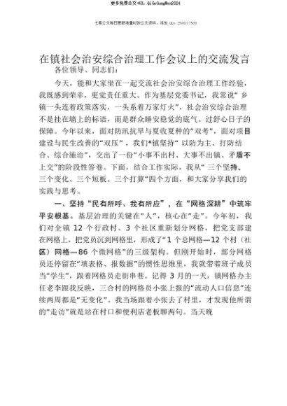 【七哥公文】2025年:【七哥公文】在镇社会治安综合治理工作会议上的交流发言+更多免费公文+VX:QiGeGongWen2024+更多免费公文+VX:QiGeGongWen2024