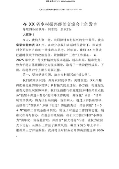 【七哥公文】2025年:【七哥公文】在XX省乡村振兴经验交流会上的发言+更多免费公文+VX:QiGeGongWen2024+更多免费公文+VX:QiGeGongWen2024