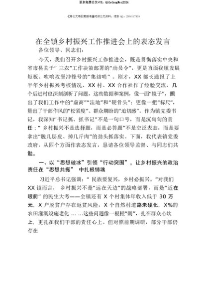 【七哥公文】2025年:【七哥公文】在全镇乡村振兴工作推进会上的表态发言+更多免费公文+VX:QiGeGongWen2024+更多免费公文+VX:QiGeGongWen2024