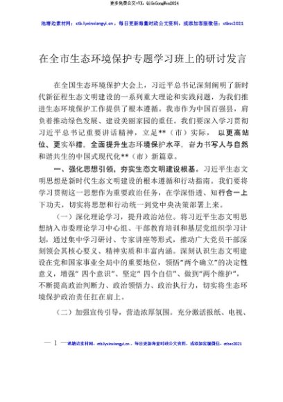【七哥公文】2025年:【七哥公文】在全市生态环境保护专题学习班上的研讨发言+更多免费公文+VX:QiGeGongWen2024+更多免费公文+VX:QiGeGongWen2024
