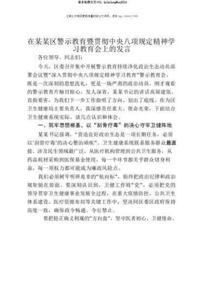 【七哥公文】2025年:【七哥公文】在某某区警示教育暨贯彻中央八项规定精神学习教育会上的发言+更多免费公文+VX:QiGeGongWen2024+更多免费公文+VX:QiGeGongWen2024