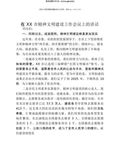 【七哥公文】2025年:【七哥公文】在XX市精神文明建设工作会议上的讲话+更多免费公文+VX:QiGeGongWen2024+更多免费公文+VX:QiGeGongWen2024