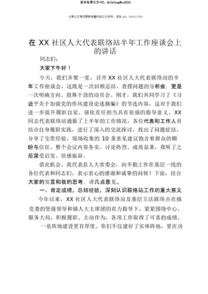 【七哥公文】2025年:【七哥公文】在XX社区人大代表联络站半年工作座谈会上的讲话+更多免费公文+VX:QiGeGongWen2024+更多免费公文+VX:QiGeGongWen2024