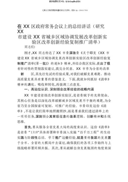 【七哥公文】2025年:【七哥公文】在XX区政府常务会议上的总结讲话(研究XX市建设XX省城乡区域协调发展改革创新实验区改革创新经验复制推广清单)+更多免费公文+VX:QiGeGongWen2024+更多免费公文+VX:QiGeGongWen2024