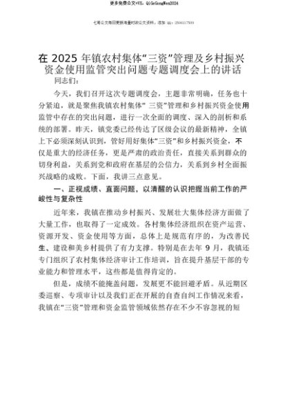 【七哥公文】2025年:【七哥公文】在2025年镇农村集体“三资”管理及乡村振兴资金使用监管突出问题专题调度会上的讲话+更多免费公文+VX:QiGeGongWen2024+更多免费公文+VX:QiGeGongWen2024