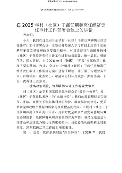 【七哥公文】2025年:【七哥公文】在2025年村(社区)干部任期和离任经济责任审计工作部署会议上的讲话+更多免费公文+VX:QiGeGongWen2024+更多免费公文+VX:QiGeGongWen2024