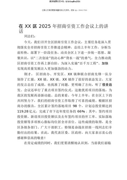 【七哥公文】2025年:【七哥公文】在XX区2025年招商引资工作会议上的讲话+更多免费公文+VX:QiGeGongWen2024+更多免费公文+VX:QiGeGongWen2024