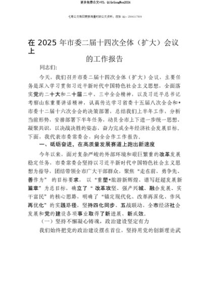 【七哥公文】2025年:【七哥公文】在2025年市委二届十四次全体(扩大)会议上的工作报告+更多免费公文+VX:QiGeGongWen2024+更多免费公文+VX:QiGeGongWen2024
