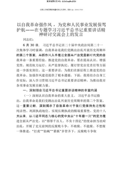 【七哥公文】2025年:【七哥公文】以自我革命强作风,为党和人民事业发展保驾护航——在专题学习习近平总书记重要讲话精神研讨交流会上的发言+更多免费公文+VX:QiGeGongWen2024+更多免费公文+VX:QiGeGongWen2024