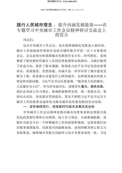 【七哥公文】2025年:【七哥公文】践行人民城市理念,提升内涵发展能效——在专题学习中央城市工作会议精神研讨交流会上的发言+更多免费公文+VX:QiGeGongWen2024+更多免费公文+VX:QiGeGongWen2024