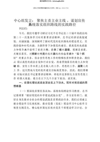 【七哥公文】2025年:【七哥公文】中心组发言:聚焦主责主业主线,谋划宣传系统落实组织路线的实践路径+更多免费公文+VX:QiGeGongWen2024+更多免费公文+VX:QiGeGongWen2024