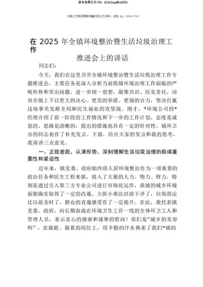 【七哥公文】2025年:【七哥公文】在2025年全镇环境整治暨生活垃圾治理工作推进会上的讲话+更多免费公文+VX:QiGeGongWen2024+更多免费公文+VX:QiGeGongWen2024