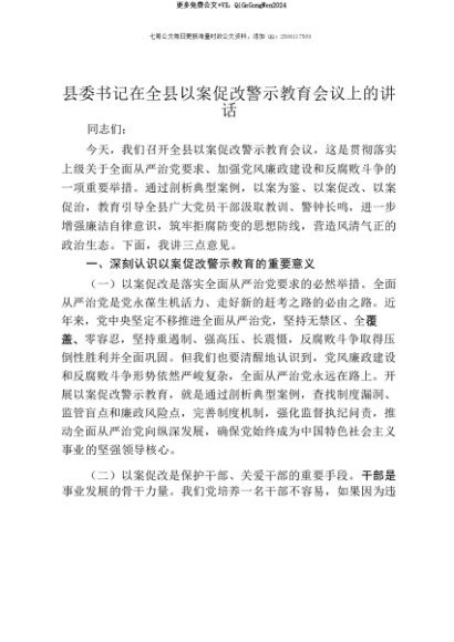 【七哥公文】2025年:【七哥公文】县委书记在全县以案促改警示教育会议上的讲话+更多免费公文+VX:QiGeGongWen2024+更多免费公文+VX:QiGeGongWen2024
