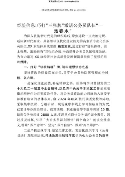 【七哥公文】2025年:【七哥公文】经验信息:巧打“三张牌”激活公务员队伍“一池春水”+更多免费公文+VX:QiGeGongWen2024+更多免费公文+VX:QiGeGongWen2024