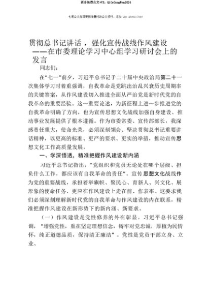 【七哥公文】2025年:【七哥公文】贯彻总书记讲话,强化宣传战线作风建设——在市委理论学习中心组学习研讨会上的发言+更多免费公文+VX:QiGeGongWen2024+更多免费公文+VX:QiGeGongWen2024