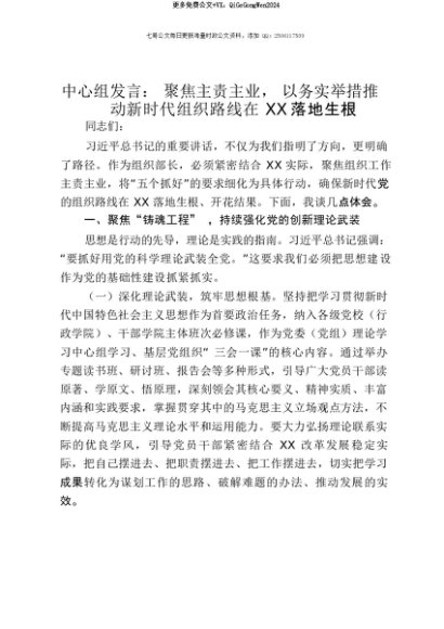 【七哥公文】2025年:【七哥公文】中心组发言:聚焦主责主业,以务实举措推动新时代组织路线在XX落地生根+更多免费公文+VX:QiGeGongWen2024+更多免费公文+VX:QiGeGongWen2024