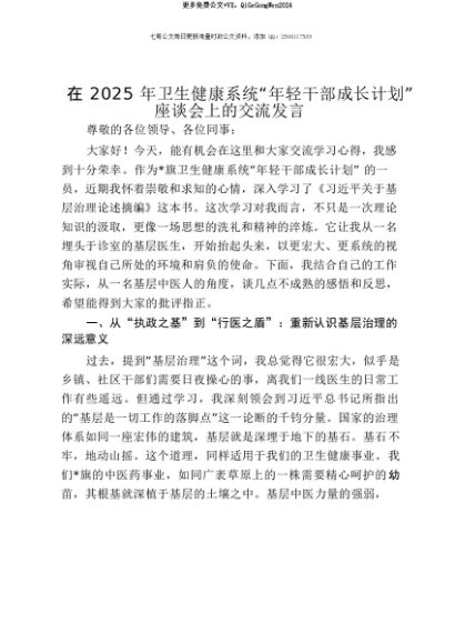 【七哥公文】2025年:【七哥公文】在2025年卫生健康系统“年轻干部成长计划”座谈会上的交流发言+更多免费公文+VX:QiGeGongWen2024+更多免费公文+VX:QiGeGongWen2024