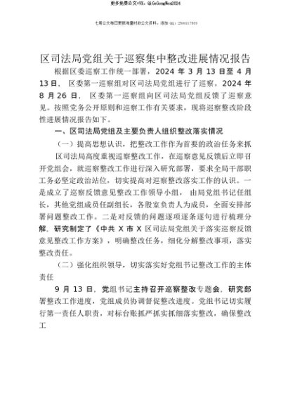 【七哥公文】2025年:【七哥公文】区司法局党组关于巡察集中整改进展情况报告+更多免费公文+VX:QiGeGongWen2024+更多免费公文+VX:QiGeGongWen2024