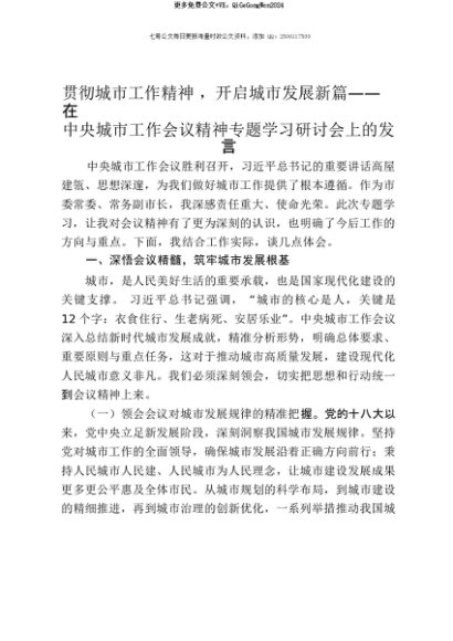 【七哥公文】2025年:【七哥公文】贯彻城市工作精神,开启城市发展新篇——在中央城市工作会议精神专题学习研讨会上的发言+更多免费公文+VX:QiGeGongWen2024+更多免费公文+VX:QiGeGongWen2024