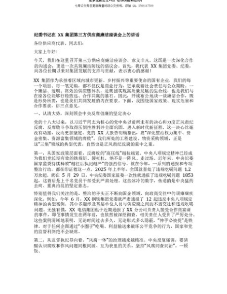 【七哥公文】2025年:【七哥公文】【团队精品】纪委书记在XX集团第三方供应商廉洁座谈会上的讲话+更多免费公文+VX:QiGeGongWen2024+更多免费公文+VX:QiGeGongWen2024
