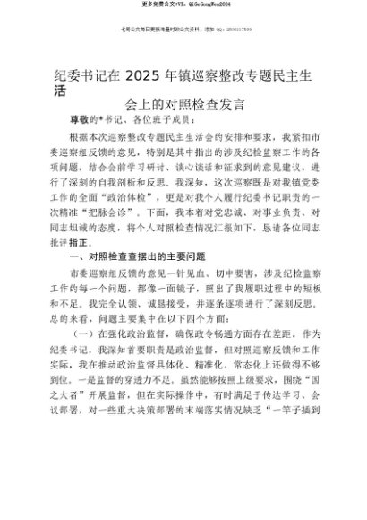 【七哥公文】2025年:【七哥公文】纪委书记在2025年镇巡察整改专题民主生活会上的对照检查发言+更多免费公文+VX:QiGeGongWen2024+更多免费公文+VX:QiGeGongWen2024