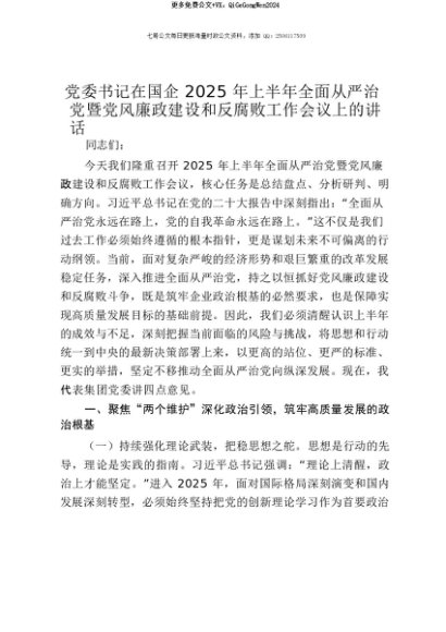 【七哥公文】2025年:【七哥公文】党委书记在国企2025年上半年全面从严治党暨党风廉政建设和反腐败工作会议上的讲话+更多免费公文+VX:QiGeGongWen2024+更多免费公文+VX:QiGeGongWen2024