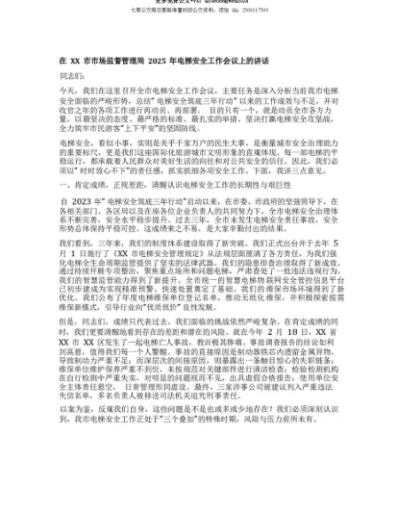 【七哥公文】2025年:【七哥公文】【团队精品】在XX市市场监督管理局2025年电梯安全工作会议上的讲话+更多免费公文+VX:QiGeGongWen2024+更多免费公文+VX:QiGeGongWen2024