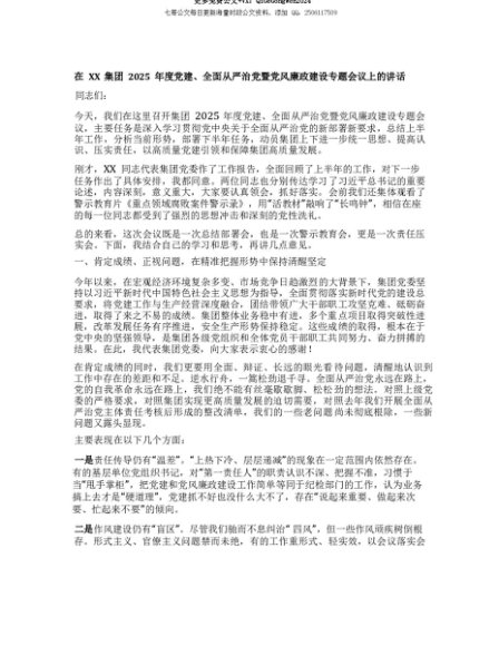 【七哥公文】2025年:【七哥公文】【团队精品】在XX集团2025年度X建、全面从严治X暨X风廉政建设专题会议上的讲话+更多免费公文+VX:QiGeGongWen2024+更多免费公文+VX:QiGeGongWen2024
