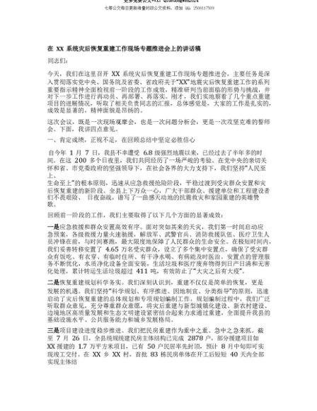 【七哥公文】2025年:【七哥公文】【团队精品】在XX系统灾后恢复重建工作现场专题推进会上的讲话稿+更多免费公文+VX:QiGeGongWen2024+更多免费公文+VX:QiGeGongWen2024
