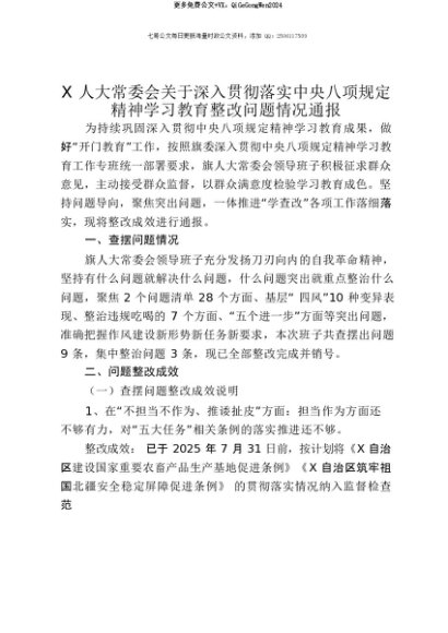 【七哥公文】2025年:【七哥公文】X人大常委会关于深入贯彻落实中央八项规定精神学习教育整改问题情况通报+更多免费公文+VX:QiGeGongWen2024+更多免费公文+VX:QiGeGongWen2024