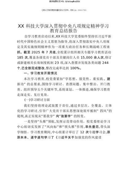 【七哥公文】2025年:【七哥公文】XX科技大学深入贯彻中央八项规定精神学习教育总结报告+更多免费公文+VX:QiGeGongWen2024+更多免费公文+VX:QiGeGongWen2024