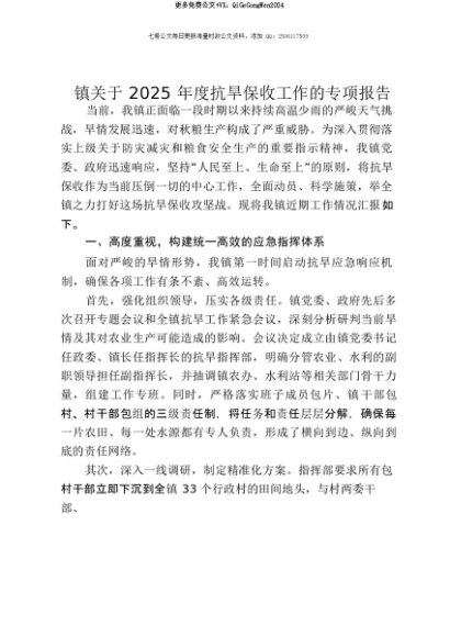【七哥公文】2025年:【七哥公文】镇关于2025年度抗旱保收工作的专项报告+更多免费公文+VX:QiGeGongWen2024+更多免费公文+VX:QiGeGongWen2024